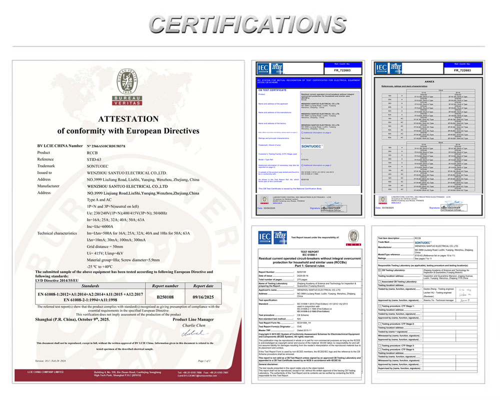 A SONTUOEC az egyik kínai beszállító/gyártó, amely különféle kisméretű elektromos készülékek gyártására szakosodott. A STID-63 sorozatú RCCB 230V 63A hibaáram-megszakító áramütés veszélye vagy a fővezeték földelése esetén azonnal megszakítja a hibaáramkört. Így alkalmas a földzárlat okozta áramütés és tűz elkerülésére. Egyfázisú 240V vagy háromfázisú 504156Hz, háromfázisú áramkörökben használható. Megfelel az IEC61008-1 szabványnak.
